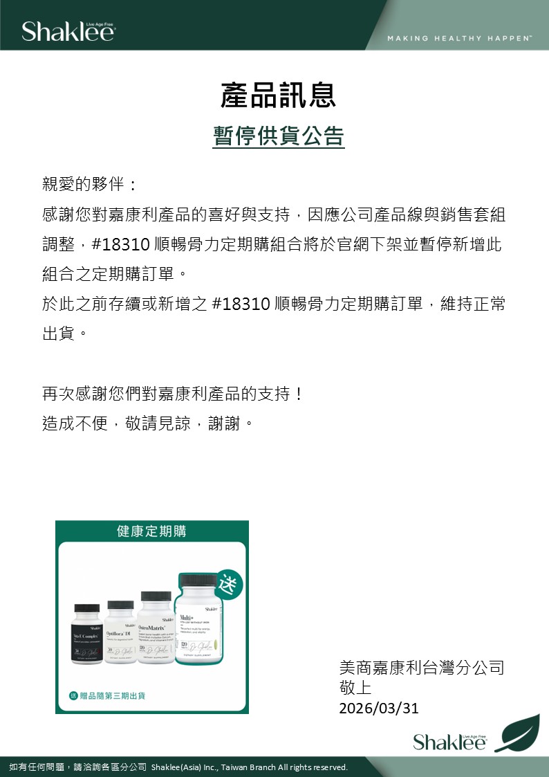 2026.03.31【 #18310 順暢骨力定期購組合】暫停供貨公告